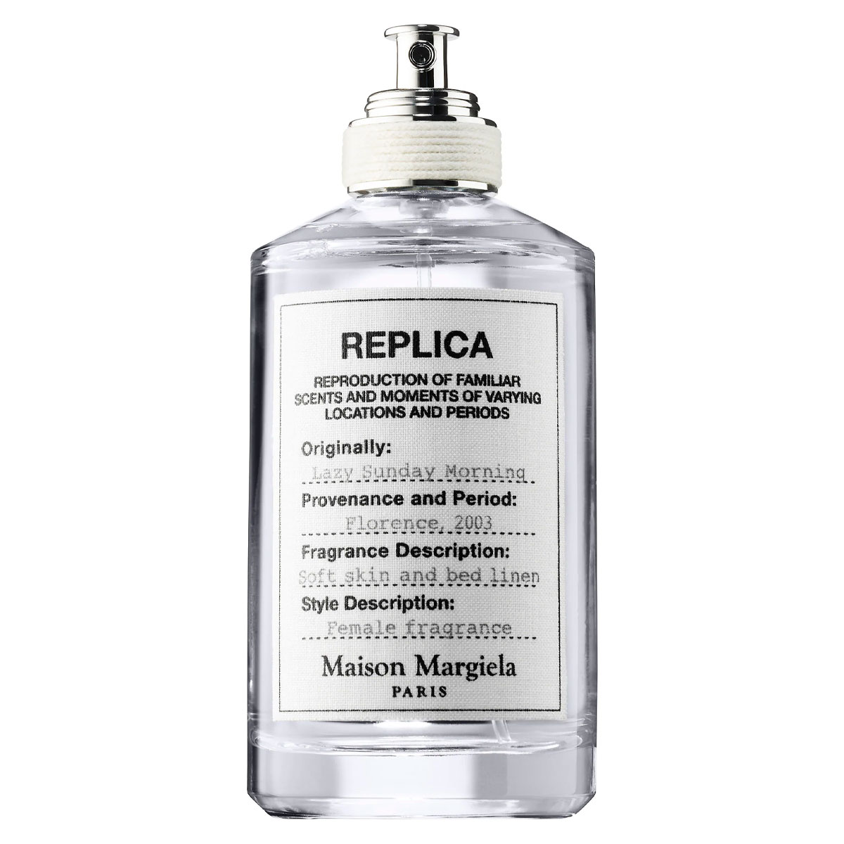 Lazy Sunday Morning của Maison Martin Margiela là một mùi hương thuộc nhóm Floral Woody Musk (Hương Hoa Gỗ Xạ Hương) dành cho cả nam và nữ, ra mắt vào năm 2013. Được sáng tạo bởi nhà pha chế Louise Turner, mùi hương này tái hiện cảm giác thoải mái, thư thái như một buổi sáng chủ nhật yên bình, nơi mọi giác quan được bao bọc bởi sự nhẹ nhàng và ấm áp.